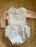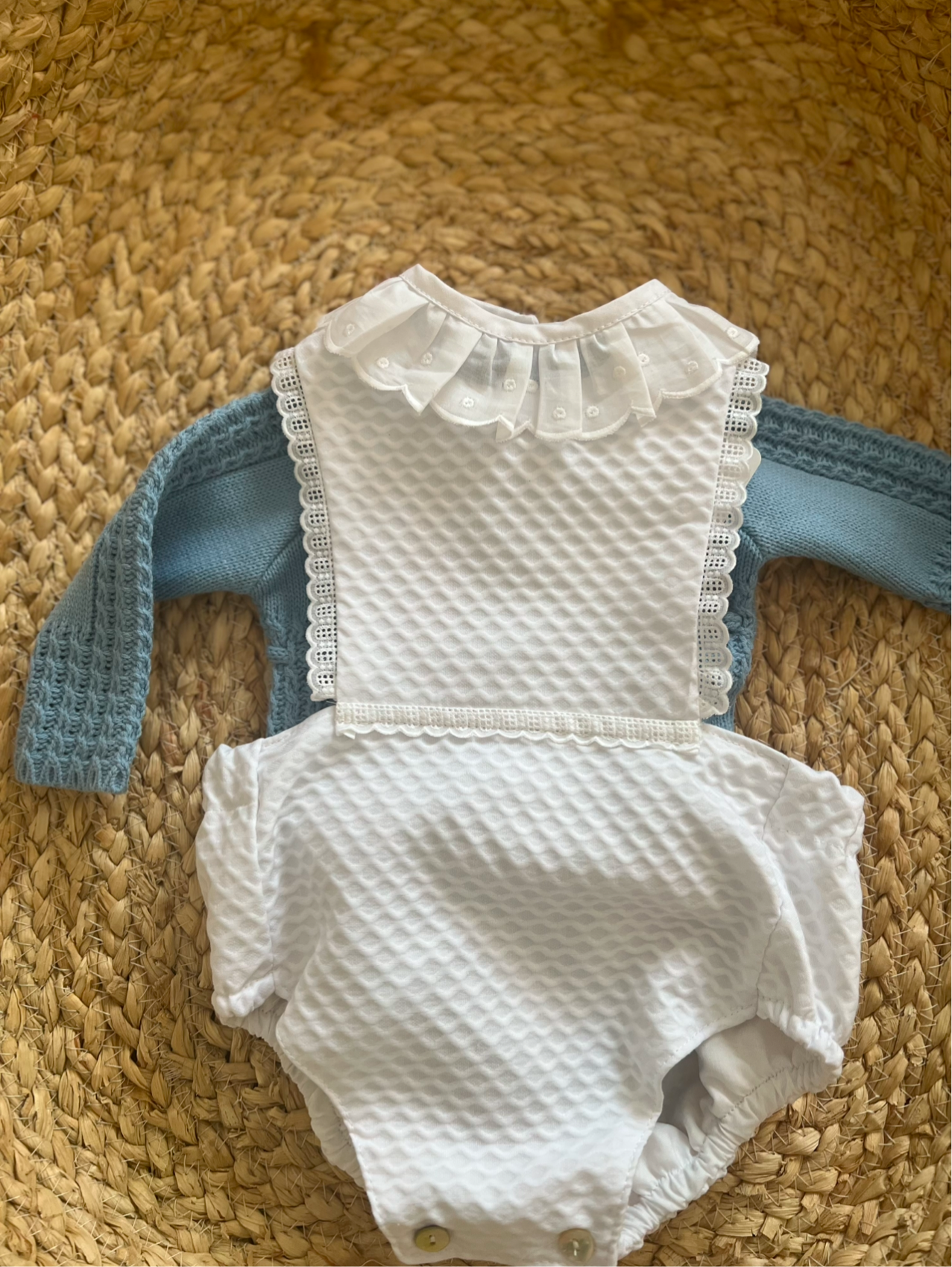 Pelele de piqué nido de abeja , tamaño grande, cuello a la caja, ribeteado de una pequeña tira bordada, con botones para facilitar cambio de pañal, la espalda está abotonada. Están forrados, 100% algodón