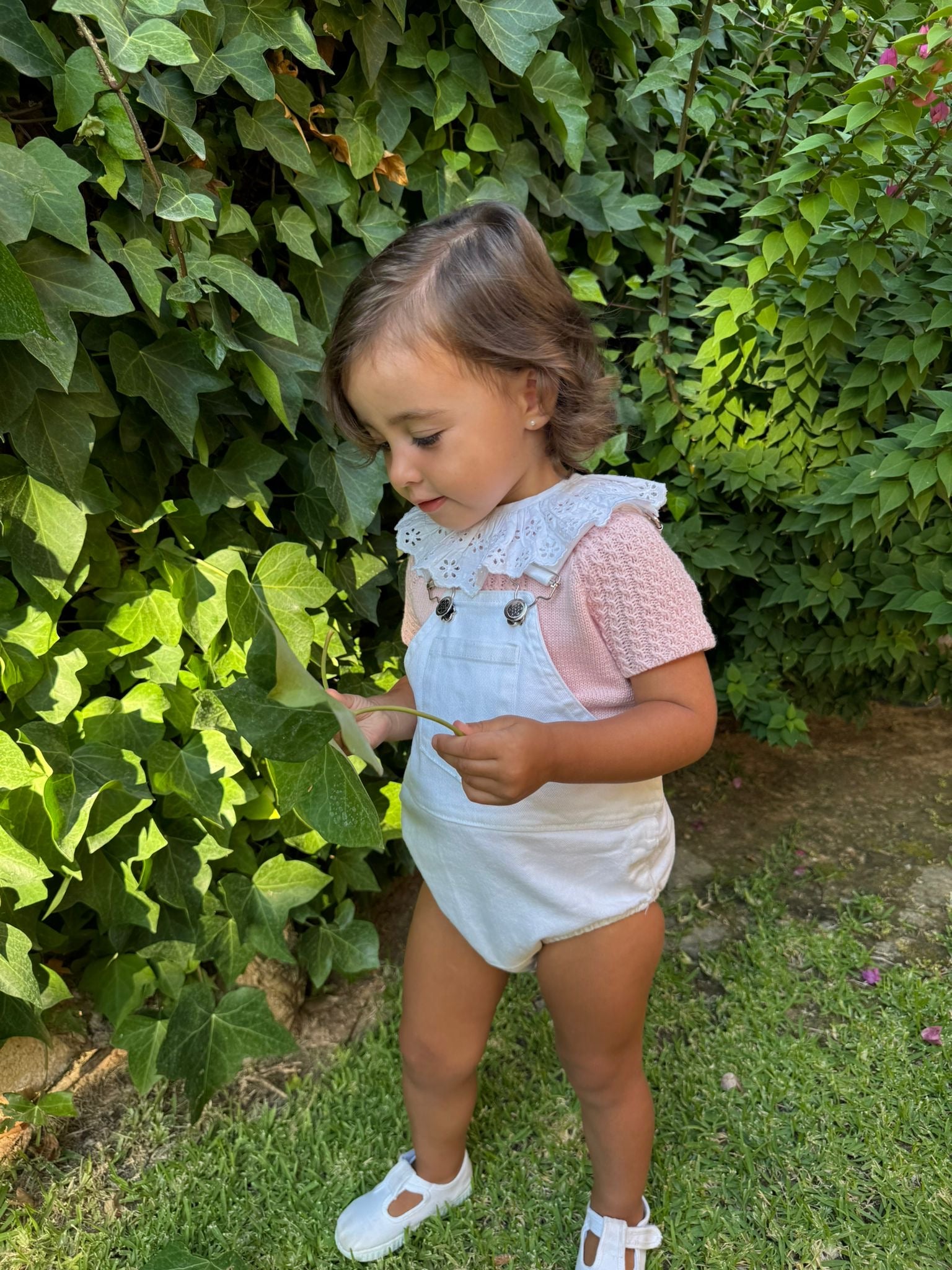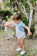 Peto vaquero blanco. Confeccionado en un resistente y suave tejido Denim. Lleva tirantes ajustables con hebillas. Tiene botones abajo para cambiar pañal con mas facilidad. Se aconseja lavar en lavadora, no dejar en remojo , porque se pueden oxidar las hebillas